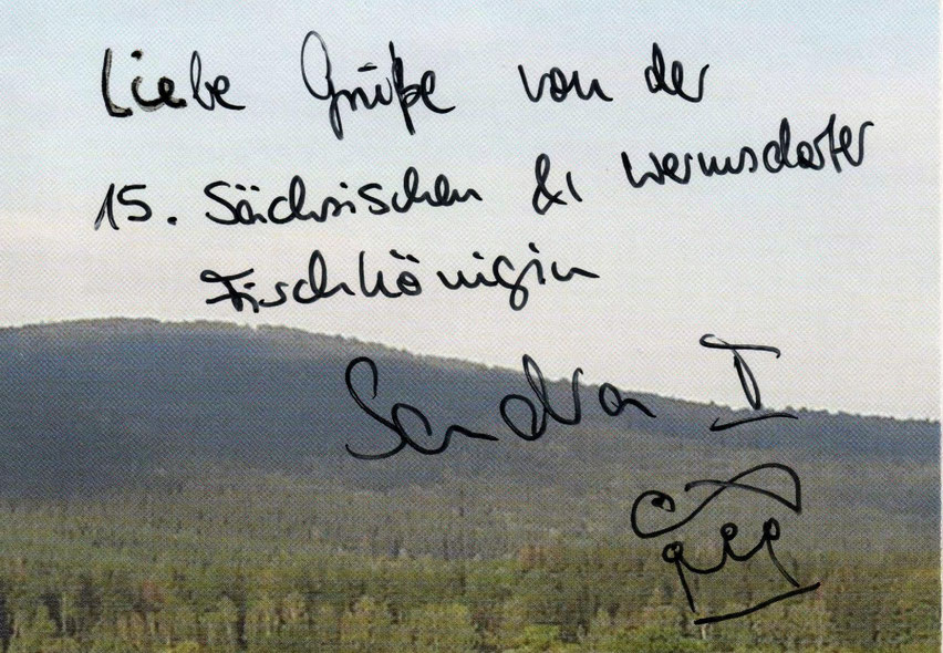 Am 14.06.2014 feierte die Forellen- und Lachszucht Ermisch in Langburkersdorf ihr 20-jähriges Firmenjubiläum. Zahlreiche Gäste nutzen diesen Tag, um bei einer Betriebsführung auch mal hinter die Kulissen zu schauen und sich etwas intensiver mit der Fischzucht auseinander zu setzen. Natürlich wurden auch die vielen leckeren Fischspezialitäten vor Ort verkostet. Sogar ihre Hoheit Sandra I., die 15. Sächsische und Wermsdorfer Fischkönigin gab sich in der Langburkersdorfer Fischzucht die Ehre. Und da es um das Thema Wasser ging, waren wir natürlich mit von der Partie. Auch wenn wir leider keine Bilder von diesem Ereignis haben, können wir doch mit einem Autogramm der Fischkönigin aufwarten. Das ist doch immerhin etwas - oder?