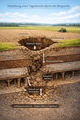Einige der alten Bergwerksanlagen geraten über Jahrhunderte in Vergessenheit – bis sie unerwartet als sogenannte Tagesbrüche wieder in Erscheinung treten. Solche Tagesbrüche entstehen, wenn alte Grubenbaue einstürzen und an der Oberfläche sichtbare Einsenkungen verursachen. Genau dies geschah im Mai 1978 südlich der „Sieben Linden“: Ein Traktor brach teilweise in unbekannte historische Grubenbaue ein. Die Bergsicherung Dresden wurde hinzugezogen und untersuchte die Schadstelle. Dabei entdeckte man einen etwa 25 Meter langen und 10 Meter breiten Hohlraum. Weitere Untersuchungen bestätigten das Vorhandensein weiterer Hohlräume in Tiefen von drei bis sechs Metern, die jeweils eine ungefähre Höhe von rund einem Meter aufwiesen. In östlicher Richtung vermutete man einen ehemaligen Stollenzugang, während man westlich einen verfüllten Schacht feststellte. Neben stark verwittertem Granodiorit trat auch Lamprophyr als anstehendes Gestein zutage. Dies legt nahe, dass in früherer Zeit sulfidische Erze abgebaut wurden – Erze, die häufig an den Kontaktzonen dieser beiden Gesteinsarten vorkommen. Um die Stabilität wiederherzustellen, wurden im Bereich der Schadstelle Bohrungen niedergebracht und die verbliebenen Hohlräume gezielt gesprengt, sodass sie kontrolliert einstürzten. Nach anschließender Verfüllung mit Erde sind heute keine sichtbaren Spuren dieses Bergbaus mehr vorhanden.
