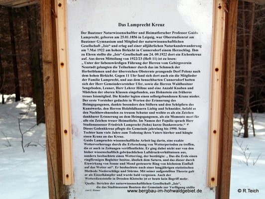 Der Bautzener Naturwissenschaftler und Heimatforscher Professor Guido Lamprecht, geboren am 25.01.1856 in Leipzig, war Oberstudienrat am Bautzener Gymnasium und Mitglied der naturwissenschaftlichen Gesellschaft „Isis" und erlag auf einer alljährlichen Naturkundewanderung am 7.Mai 1922 am hohen Birkicht in Cunnersdorf einem Herzschlag. Ihm zu Ehren stellte die „Isis"-Gesellschaft am 24. 09.1922 dort ein Eichenkreuz auf. Aus deren Mitteilung von 1922/23 (Heft 11) ist zu lesen: „Unter der liebenswürdigen Führung der Herren vom Gebirgsverein Neustadt gelangten die Teilnehmer durch das im Schmuck der Herbstblumen und der überreichen Obsternte prangende Dorf Polenz nach dem hohen Birkicht. Gegen 11 Uhr fanden sich dort auch ein die Mitglieder der Familie Lamprecht, und aus dem benachbarten Cunnersdorf hatten sich der Herr Gemeindevorsteher Ufer, sowie die Herren Waldbesitzer Sengeboden, Leuner, Herr Lehrer Höhne und eine Anzahl Knaben und Mädchen der oberen Klassen eingefunden, aus Hohnstein ein früheres treues Isismitglied. Die Kinder legten einen selbstgebundenen Kranz nieder. Der erste Vorsteher gedachte in Worten der Erinnerung des Heimgegangenen, dankte besonders den Stiftern und den Schöpfern des Kunstwerks, den Herren Holzbildhauern Liebig und Schneider, befahl es den Nachbewohnenden zu treuem Schutze und weihte es als ein Zeichen dankbarer Erinnerung an dem Heimgegangenen, als ein Momento mori für alle ein Zeichen treuer Heimatliebe. Im Namen der Familie sprach Herr Studienassessor Friedrich Lamprecht (Sohn) kurze Dankesworte." Dieses Gedenkkreuz pflegte die Gemeinde jahrelang bis 1990. Seine Tochter kam viele Jahre zum Todestag ihres Vaters hierher und hängte einen Kranz an das Kreuz. Guido Lamprechts wissenschaftliche Arbeit lag darin, eine exakte Wettervorhersage durch die Erforschung von Wetterperioden zu treffen, die er auch in Zeitungen veröffentlichte. Er ging dabei nicht nur von den bisher wissenschaftlich gebräuchlichen Luftdruckverhältnissen aus, sondern beobachtete einen Wetterring, der bestätigte: „ Das die Erde einen ringförmigen Begleiter besitze, ähnlich dem Saturn, und das dieser durch Einwirkung von Sonne und Mond gesteuerte Ring von höchstem Einfluss auf das Wetter sei". Er beobachtete nach einer langjährigen statistischen Methode Niederschläge und Stürme. Mit seiner aufgestellten Theorie galt er als Einzelkämpfer und wurde bald vergessen. Auch der Wetterdienststelle in Dresden-Klotsche ist er heute kein Begriff mehr.