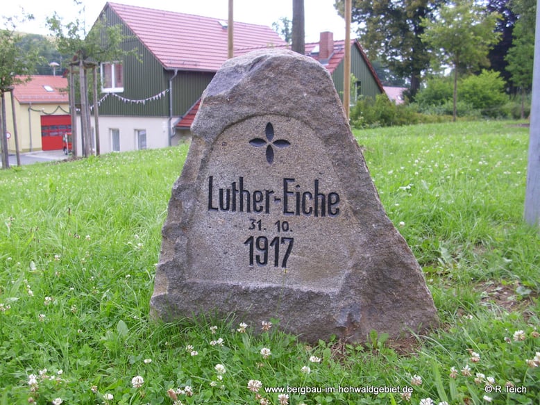 Es müssen nicht immer große Denksteine sein, um an besondere Menschen oder Ereignisse zu erinnern. Eine schöne Tradition ist es seit Jahrhunderten sogenannte Gedenk-Bäume zu pflanzen. So wurde auch im Jahre 1917 anlässlich des 400. Jubiläums der Reformation eine sogenannte Luther-Eiche in Polenz gepflanzt. Ein kleiner Denkstein wurde ebenfalls gesetzt. Dieser Baum stand allerdings an einem anderen Standort im Dorfgebiet und musste bereits in den 1980er Jahren gefällt werden. Es wurde zwar eine neue Eiche gepflanzt, doch auch diese sollte kein langes Leben an dieser Stelle haben. Durch notwendig gewordene Brücken- und Straßenbauarbeiten in den 90er Jahren musste die „neue“ Luthereiche von ihrem Standort weichen. Um eine Fällung zu vermeiden, wurde der Baum samt seinem Denkstein aufwendig an das damalige Heimathaus versetzt. Der Baum überstand diese Prozedur glücklicherweise und wuchs gut an. Jedoch wurde das Haus später Privatbesitz, und Baum samt Denkstein war nicht mehr öffentlich zugänglich. Aber auch dafür gab es wieder eine Lösung. Anlässlich der 750-Jahr-Feier von Polenz wurde am 1. Juni 2012 eine neue Luthereiche am Festplatz gepflanzt. Der historische Denkstein konnte ebenfalls mit am neuen Standort wieder aufgestellt werden.