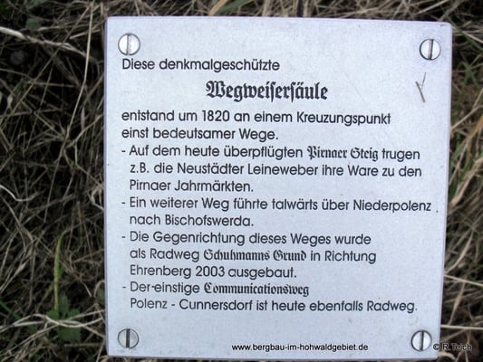 Wer den Radweg von Polenz in Richtung Cunnersdorf / Hohes Birkigt geht, findet nach dem Drachenberg an einer Weggabelung am rechten Wegesrand eine gut renovierte Wegsäule. Diese Säule soll um das Jahr 1820 an dieser ehemals wichtigen Kreuzung aufgestellt worden sein. An dieser Stelle zweigten zwei für damalige Verhältnisse wichtige Wege vom Pirnaer Steig, welcher von Neustadt nach Pirna führte, ab. Nach rechts führte ein Verbindungsweg über die Felder hinab in das Unterdorf von Polenz. Dieser Weg ist heute nicht mehr vorhanden, da er komplett umgepflügt wurde. Wer seinen Verlauf heute nachvollziehen möchte, kann nur noch alte Messtischblätter dazu nutzen. Der zweite Weg führte in Richtung Ehrenberg und hat sich ebenfalls wie der Pirnaer Steig bis in die heutige Zeit als Radrundweg erhalten.